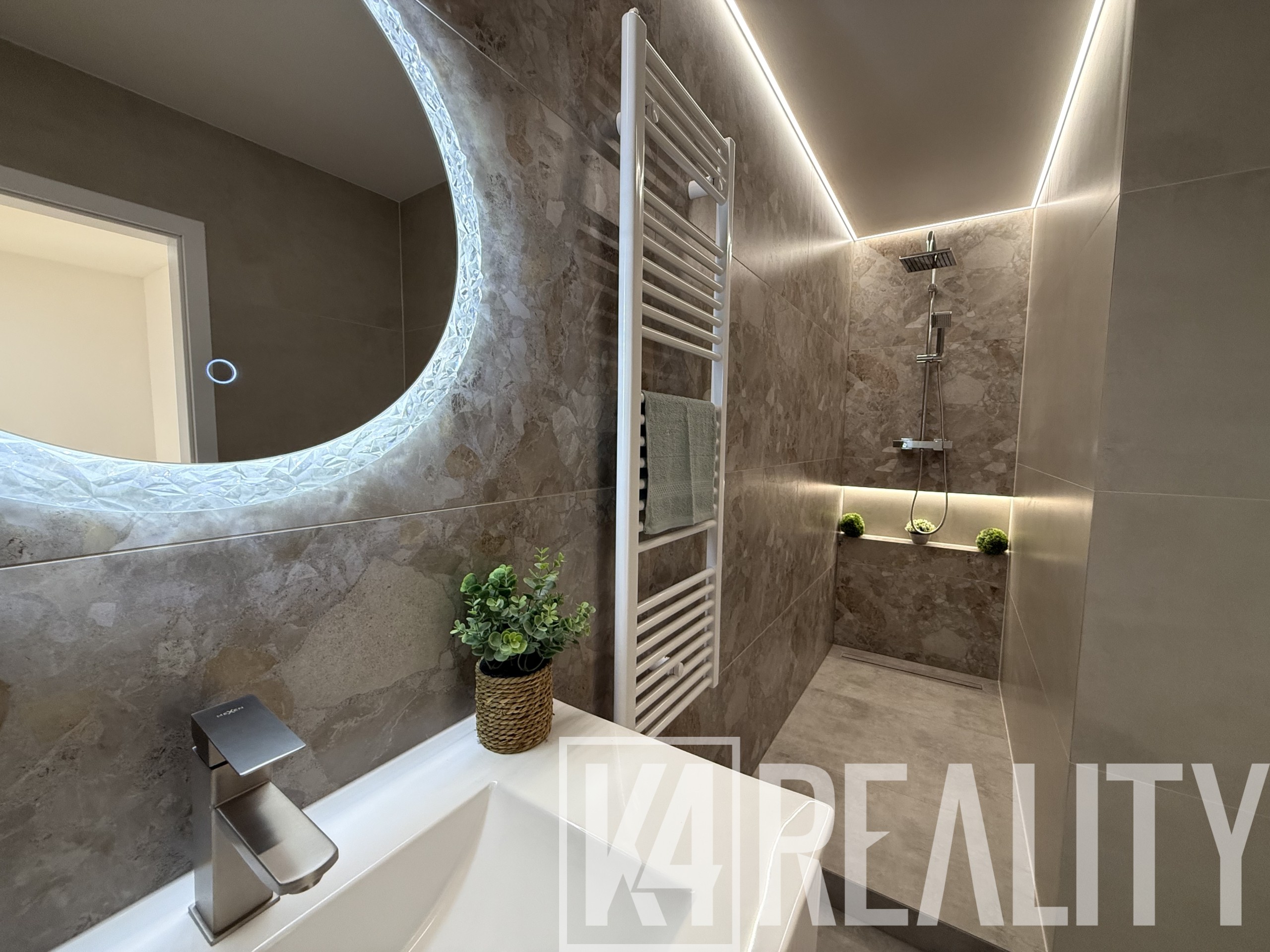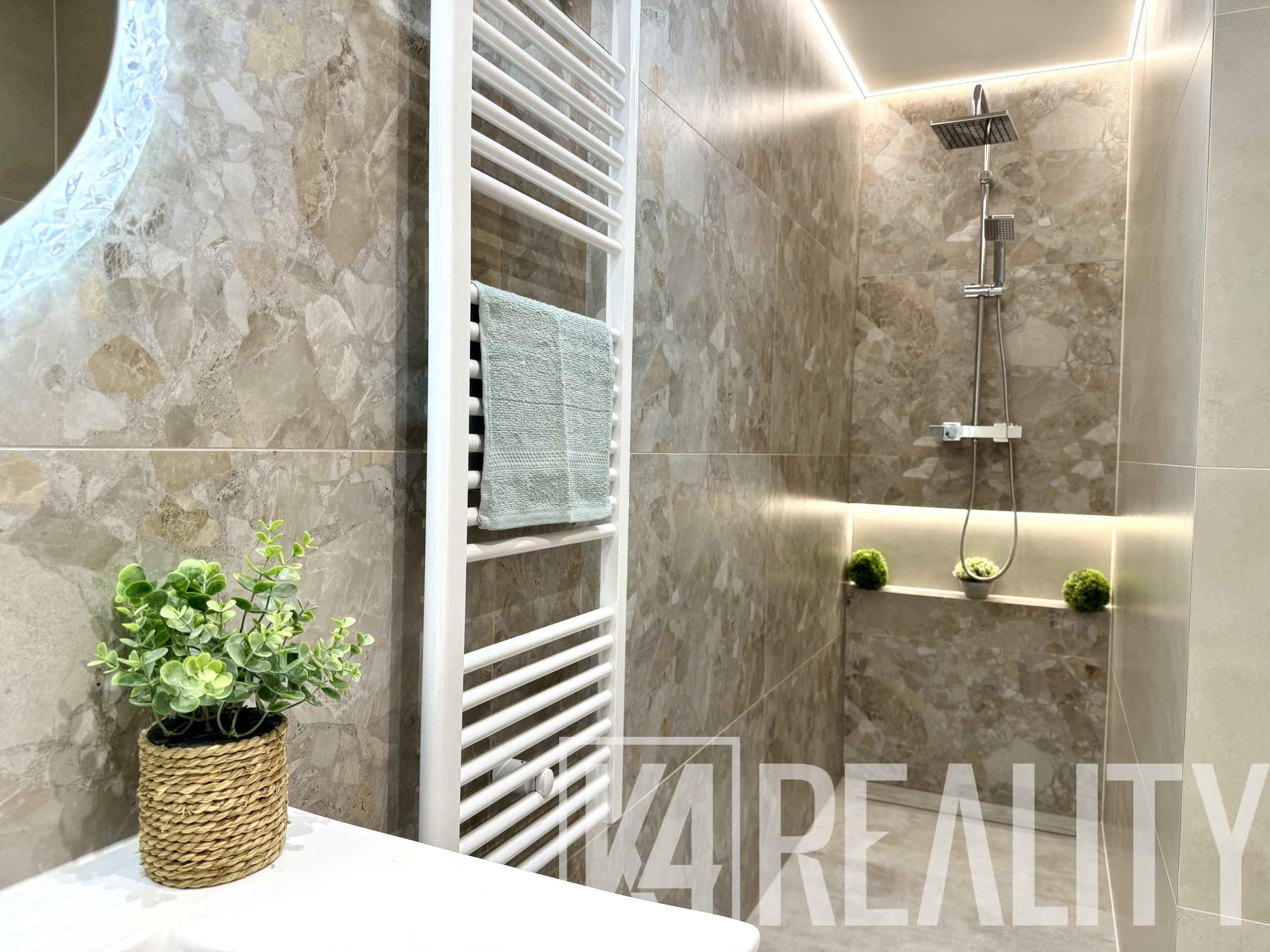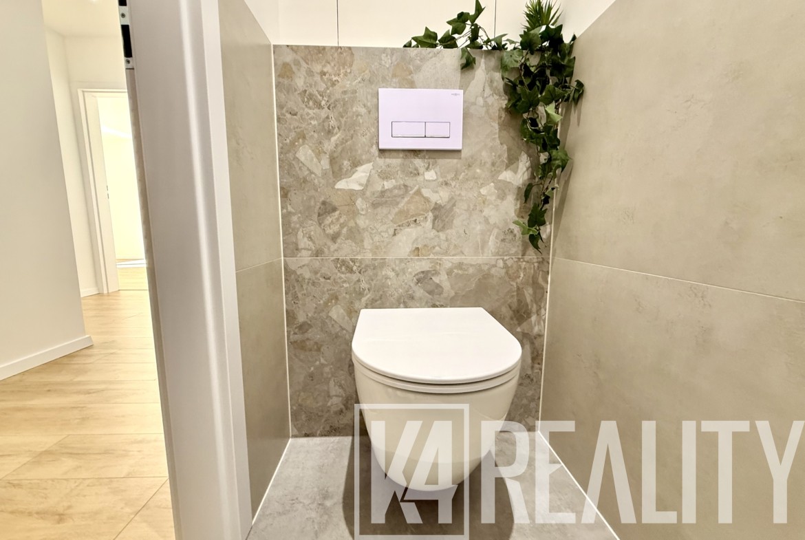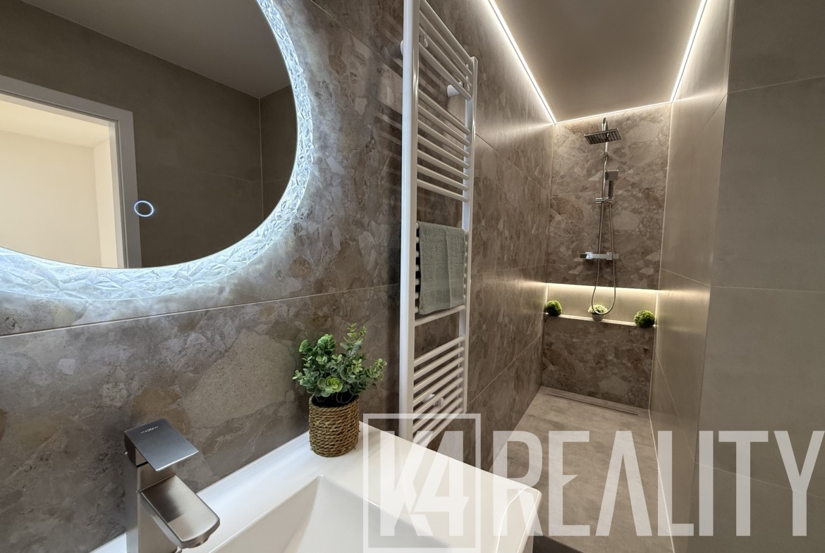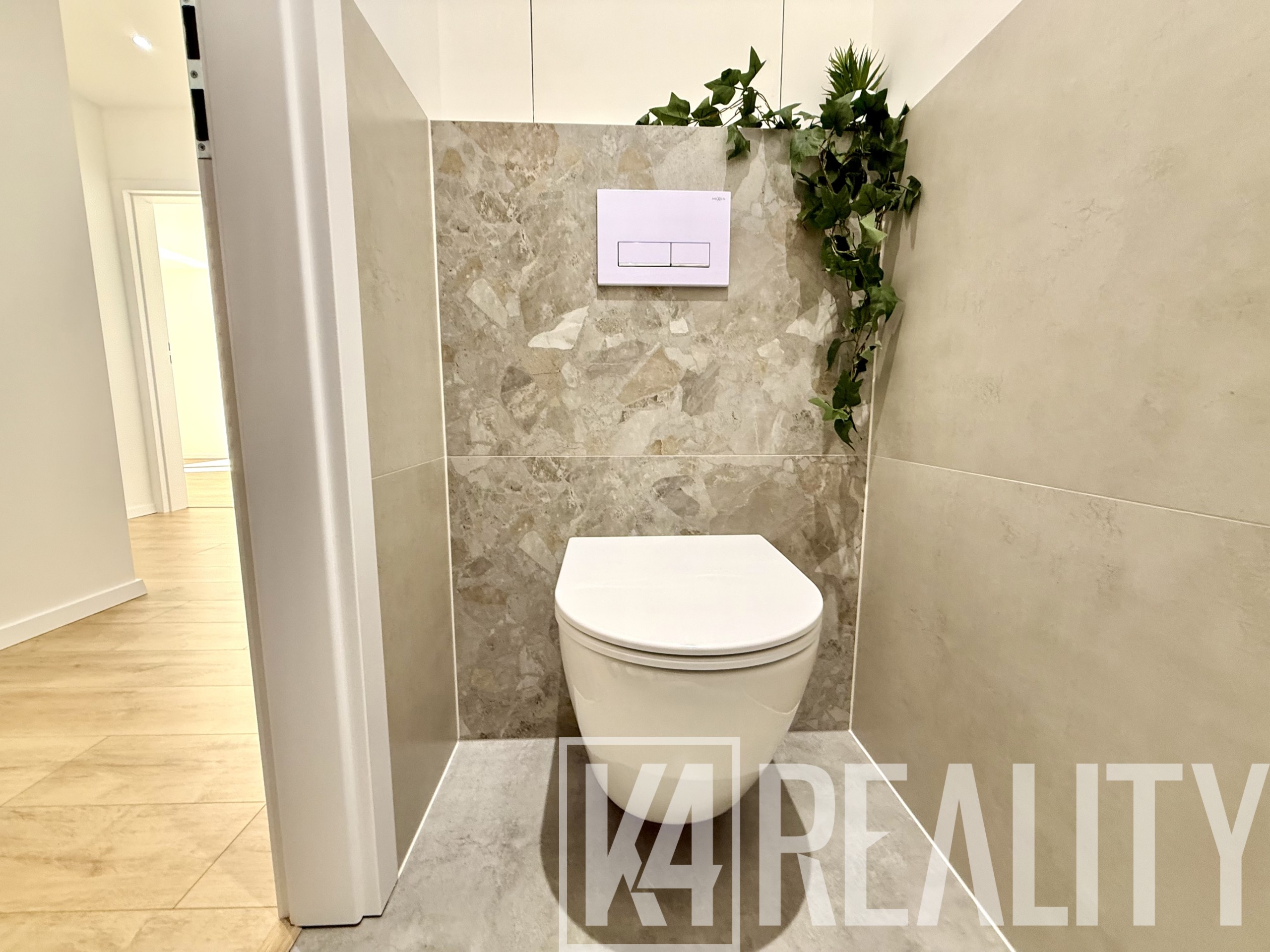 Úplne nová kompletná rekonštrukcia zahŕňa zmenu dispozície a vymurovania nového bytového jadra, v ktorom sú osadené príjemné LED pásy a podsvietené zrkadlo, murovaný sprchový kút s termostatickou sprchovou batériou, umývadlo so skrinkou a nechýba ani priestor pre práčku so sušičkou. V kúpeľňovom priestore dominuje aktuálne veľmi žiadaný veľkoformátový obklad. V rovnako ladenom štýle je na samostatnom WC zabudovaný nový Geberit systém. V rámci rekonštrukcie sme taktiež osadili úplne nové dvere so zárubňami a boli vymenené rozvody vody a elektriny, nové radiátory, podlahy, stierky a sadrokartónové stropy s LED bodovým osvetlením. K bytu prislúcha aj pivnica v prvom podzemnom podlaží.