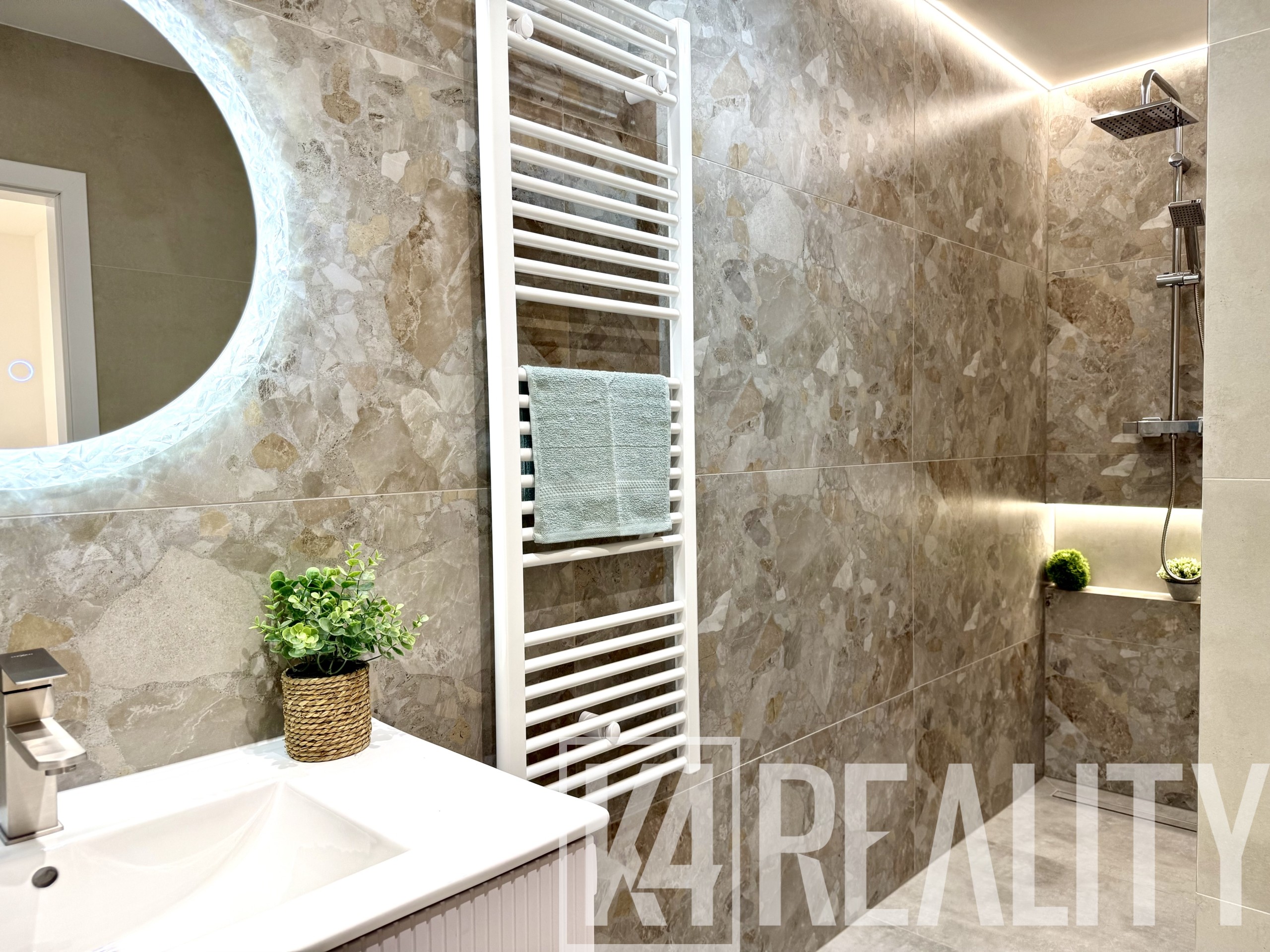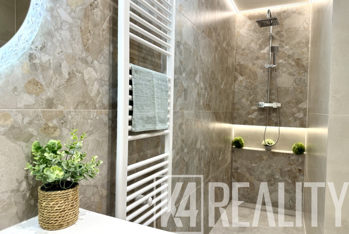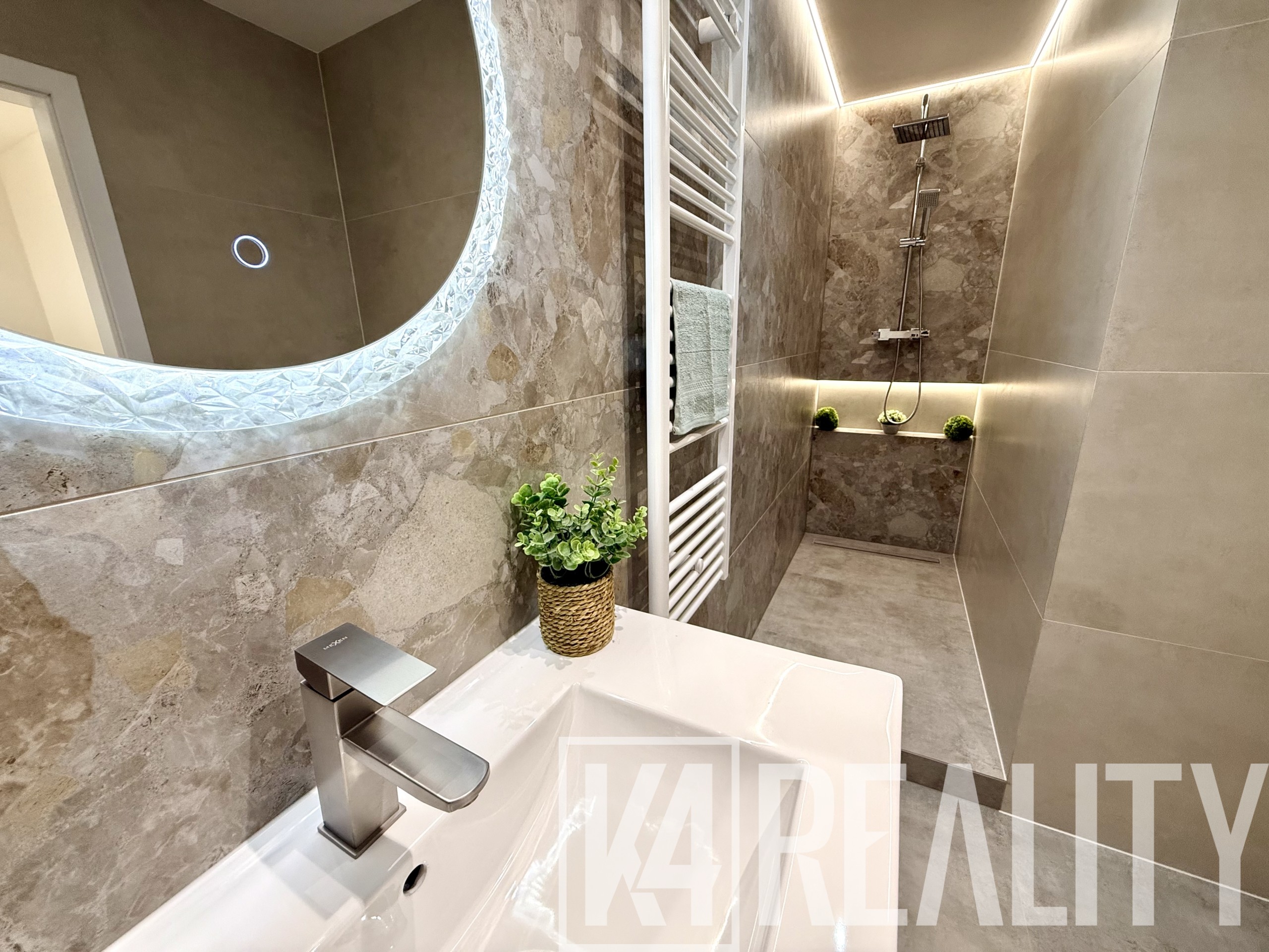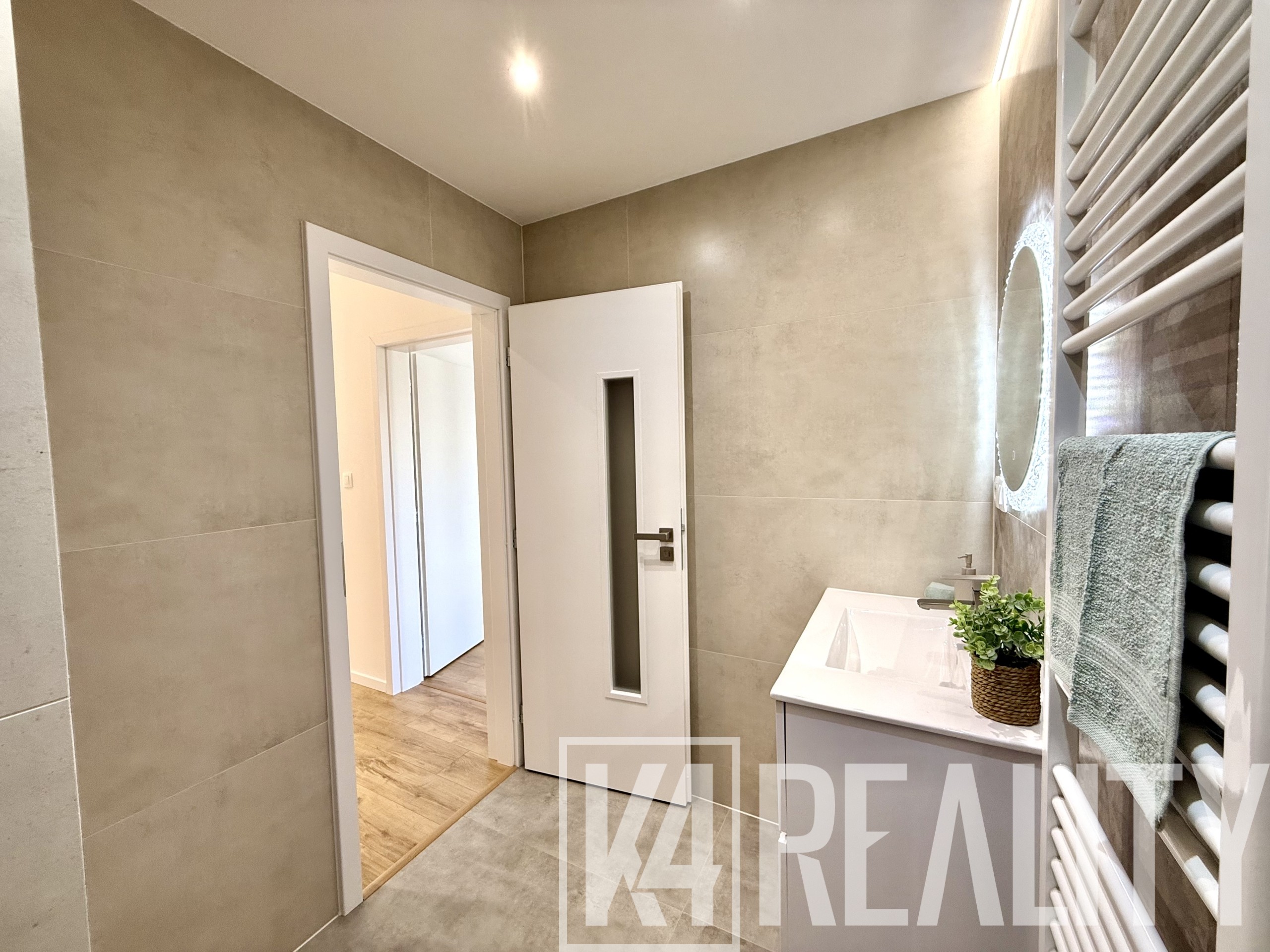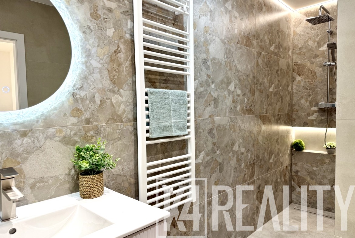 Úplne nová kompletná rekonštrukcia zahŕňa zmenu dispozície a vymurovania nového bytového jadra, v ktorom sú osadené príjemné LED pásy a podsvietené zrkadlo, murovaný sprchový kút s termostatickou sprchovou batériou, umývadlo so skrinkou a nechýba ani priestor pre práčku so sušičkou. V kúpeľňovom priestore dominuje aktuálne veľmi žiadaný veľkoformátový obklad. V rovnako ladenom štýle je na samostatnom WC zabudovaný nový Geberit systém. V rámci rekonštrukcie sme taktiež osadili úplne nové dvere so zárubňami a boli vymenené rozvody vody a elektriny, nové radiátory, podlahy, stierky a sadrokartónové stropy s LED bodovým osvetlením. K bytu prislúcha aj pivnica v prvom podzemnom podlaží.