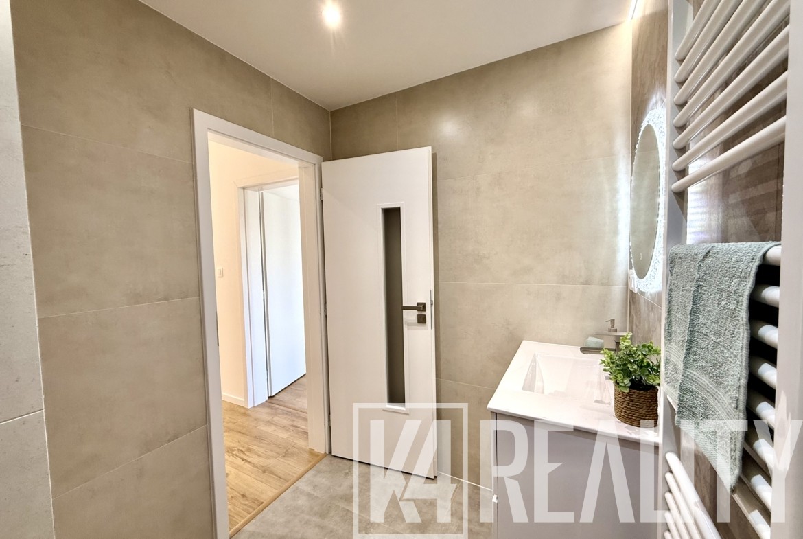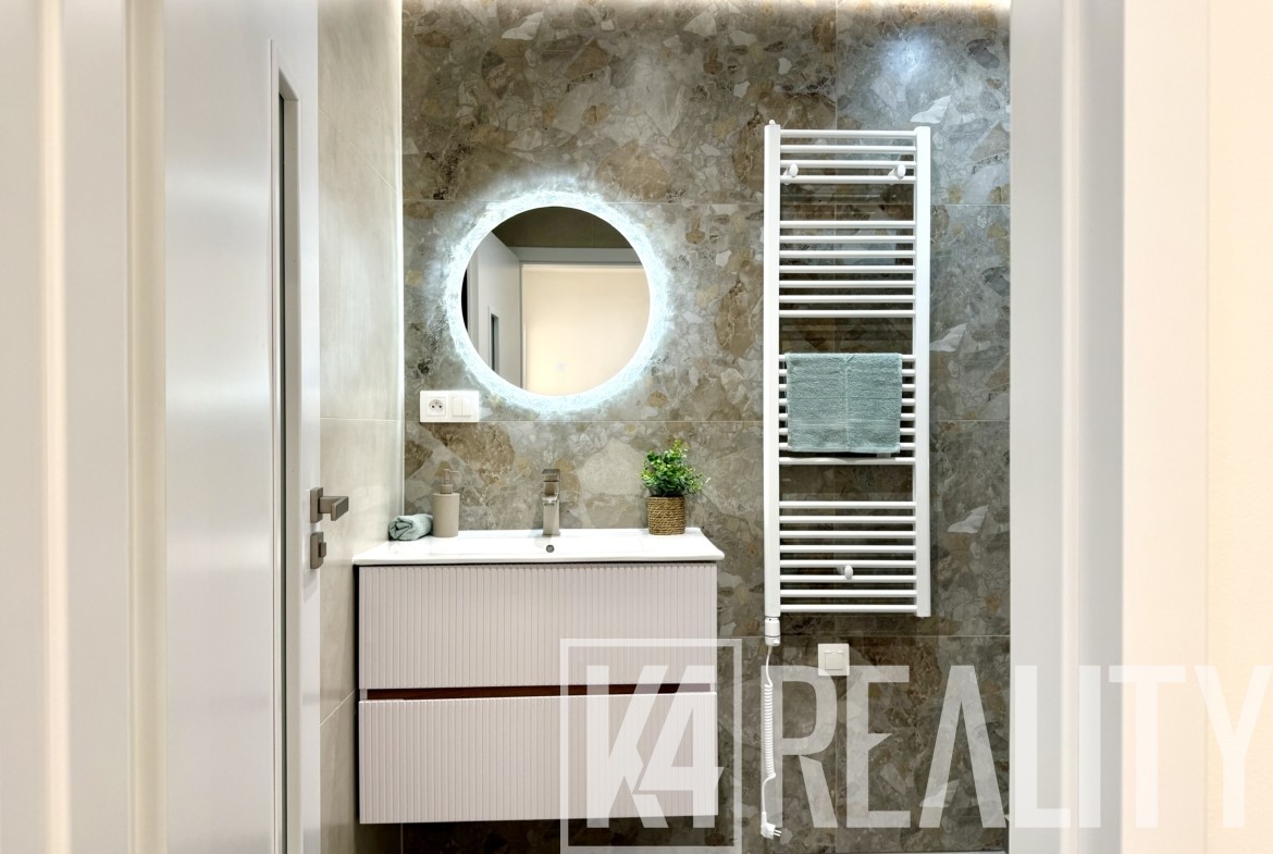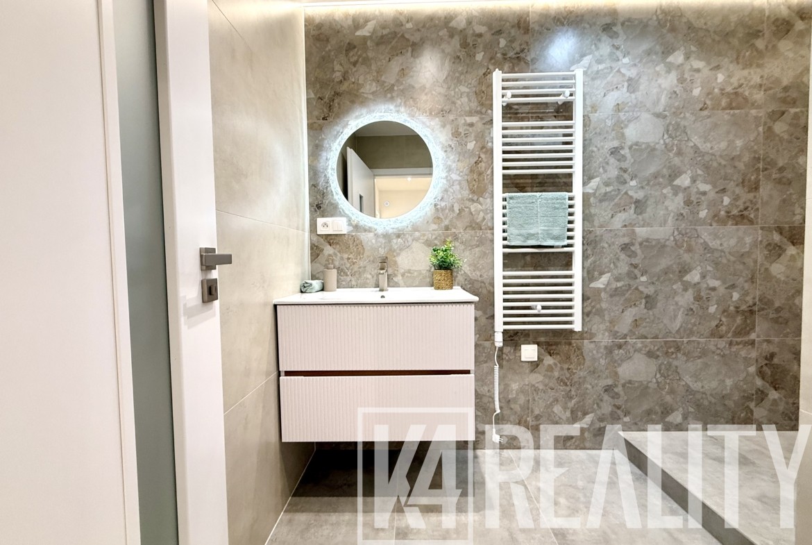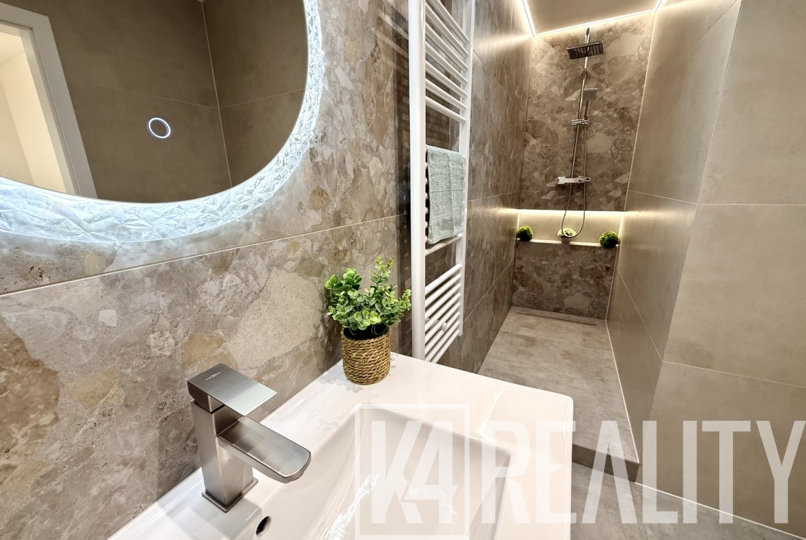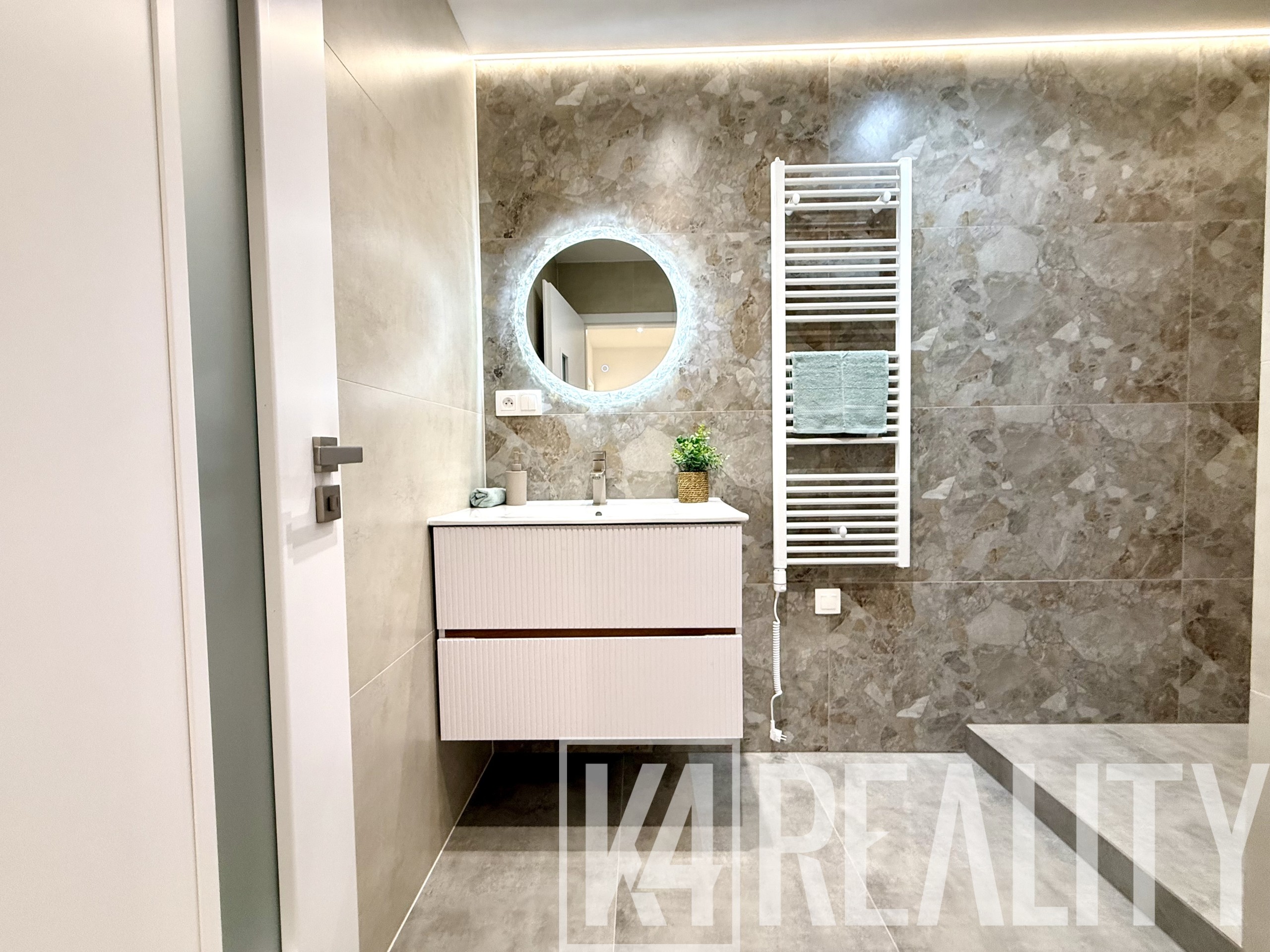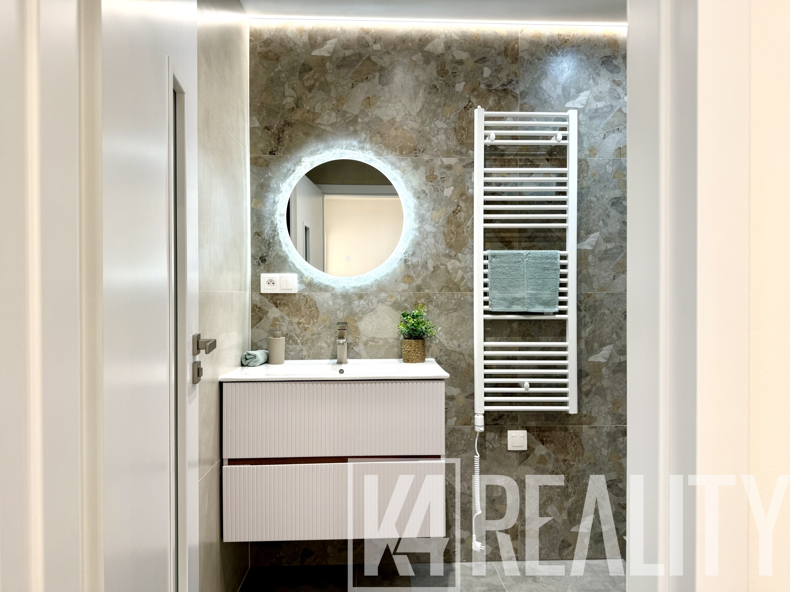 Úplne nová kompletná rekonštrukcia zahŕňa zmenu dispozície a vymurovania nového bytového jadra, v ktorom sú osadené príjemné LED pásy a podsvietené zrkadlo, murovaný sprchový kút s termostatickou sprchovou batériou, umývadlo so skrinkou a nechýba ani priestor pre práčku so sušičkou. V kúpeľňovom priestore dominuje aktuálne veľmi žiadaný veľkoformátový obklad. V rovnako ladenom štýle je na samostatnom WC zabudovaný nový Geberit systém. V rámci rekonštrukcie sme taktiež osadili úplne nové dvere so zárubňami a boli vymenené rozvody vody a elektriny, nové radiátory, podlahy, stierky a sadrokartónové stropy s LED bodovým osvetlením. K bytu prislúcha aj pivnica v prvom podzemnom podlaží.